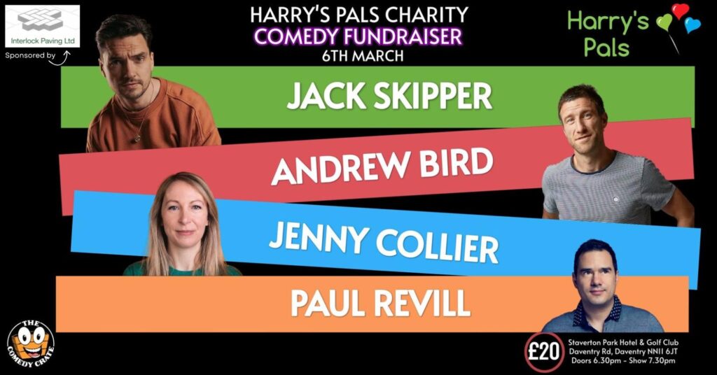 Come along and have a laugh, in aid of our fantastic cause, Harry’s Pals. For a £20 per person donation to Harry’s Pals you will get to see four fantastic comedians who are really making their names known.